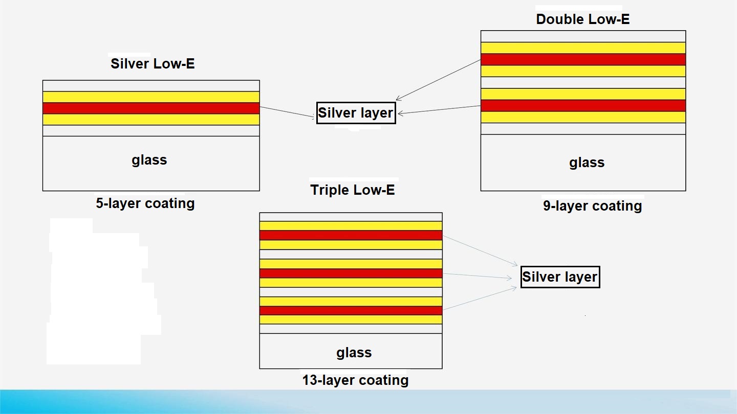 - Double-silver Low-E: 2 silver layers, structure: Glass / Dielectric / Barrier / Ag1 / Barrier / Dielectric / Barrier / Ag2 / Barrier / Dielectric.